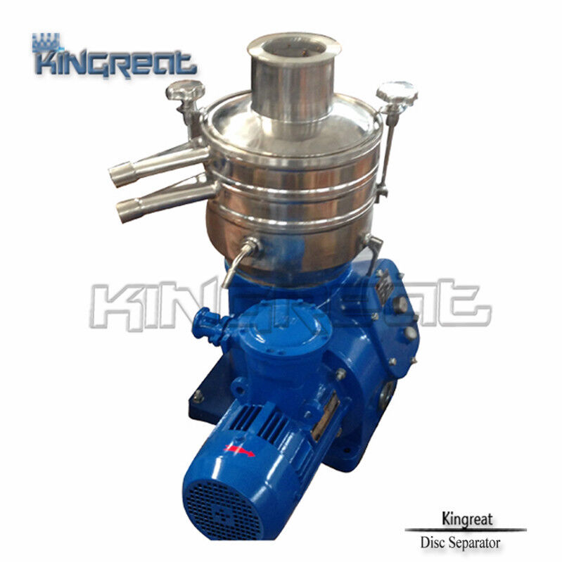 Disc separator is vertical centrifuge. The drum is installed on the upper side of the vertical shaft. Driven by the motor, it will rotate at a high speed through the gearing. Inside the drum there is a group of dish parts overlaying each other – disc. There is very small gap between the disc. Suspension (or emulsion) is fed into the drum through the inlet in the middle of the drum. When the suspension (or emulsion) flows through the gap between the disc, under the action of the centrifuge, the solid particles (or droplets) go down to the disc in the formation of sediment (or liquid layer). Along the disc surface, the sediment slides out of the disc and accumulates at the part with the largest diameter inside the drum. After the separation, the liquid is discharge out of the drum from the drain outlet. The role of the disc is to reduce the sediment distance of solid particles (or droplets) and enlarge the sediment area of the drum. With the disc inside the drum, the capacity of the separator is improved greatly. The solid gathering inside the drum is manually removed by taking apart the drum after power off, or discharges from the drum through the slag-off part with the separator power on.